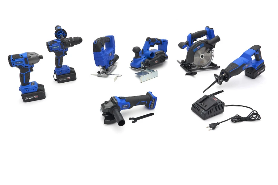 Deze 7 delige combiset bestaat uit een accuboor, schaaf, cirkelzaag, decoupeerzaag, slagschroevendraaier, haakse slijper en een reciprozaag.