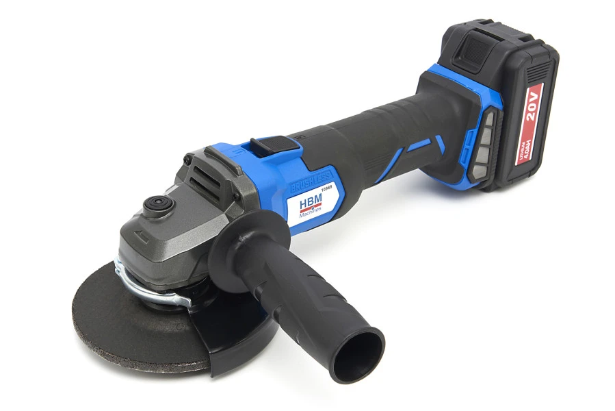 Deze HBM haakse slijper biedt vele voordelen! Zo is hij snoerloos, omdat hij op een krachtige 20V 4Ah Li-Ion accu werkt. Ook heeft deze slijpmachine een koolborstelloze motor wat de levensduur extreem verlengt en het onderhoud tot nul reduceert. De beschermkap is met een snelspanmechanisme makkelijk in een andere positie te zetten. Het extra handvat kan zowel links als rechts van de kop worden gemonteerd. Het motorhuis biedt een interne corridor voor het gefilterd aanzuigen en afvoeren van de warmte van de motor.