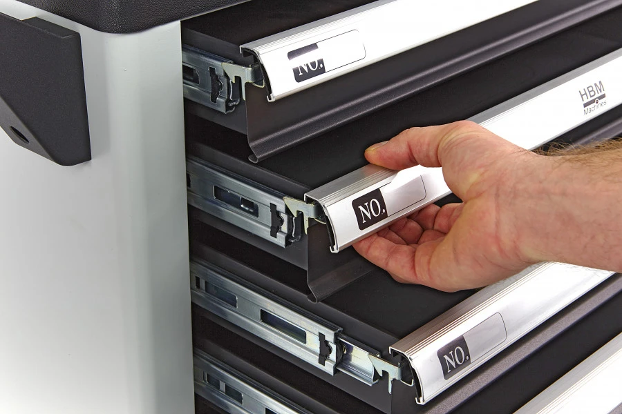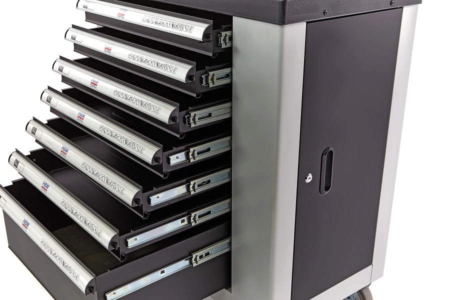 Deze gereedschapswagen is zeer wendbaar dankzij de twee zwenkwielen met rem, twee vaste wielen en het stevige handvat. Alle laden openen soepel dankzij de dubbel kogelgelagerde geleiders. De gereedschapswagen kan centraal worden afgesloten en wordt geleverd met een reservesleutel.