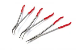 De bek van de eerste tang uit deze set heeft een rechte punt. Hiermee knip je allerlei dun materiaal door. De bek van tang twee heeft een punt van 45 graden en is daardoor geschikt voor het grijpen van kabels en draden die op de wat lastige plekken zijn gesitueerd. De derde lange tang heeft een bek van 90 graden, hiermee grijp je draden die nog moeilijker bereikbaar zijn.