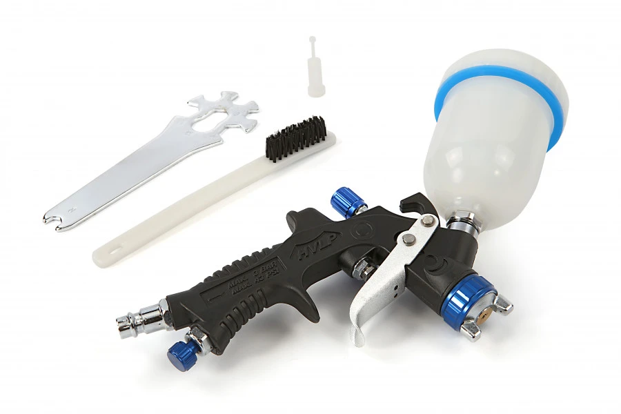 Bij deze professionele verfspuit van HBM zit de kunststof beker aan de bovenkant. De beker kan je eenvoudig losschroeven van het pistool waarna je ‘m kunt vullen met verf of lak. Omdat de beker makkelijk te verwijderen is, kan je ‘m goed schoonmaken. Veel modelbouwers of autospuiters gaan graag met deze verfspuit aan de slag gaan om te verven of te lakken. De opening van de sproeier is met 0,8 mm heel geschikt om bijvoorbeeld kleine beschadigingen aan de lak van een auto of een voorwerp te repareren.