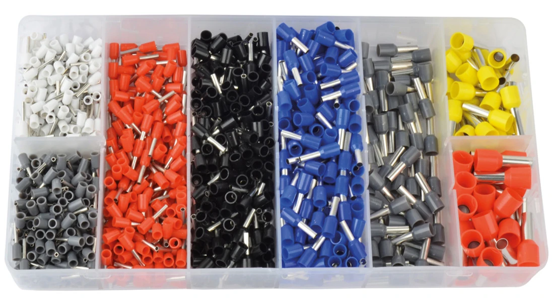 | Hulzen | 200 x E0508 wit 0,5mm², 200 x E7508 grijs 0,75mm², 200 x E1008 rood 1,0mm², 250 x E1508 zwart 1,5mm², 250 x E2508 blauw 2,5mm², 50 x E4009 grijs 4,0mm², 25 x E6012 geel 6,0mm², 25 x E10-12 rood 10mm² |