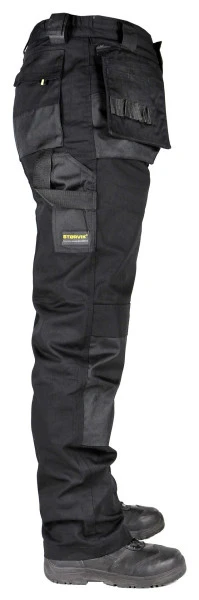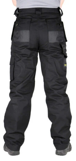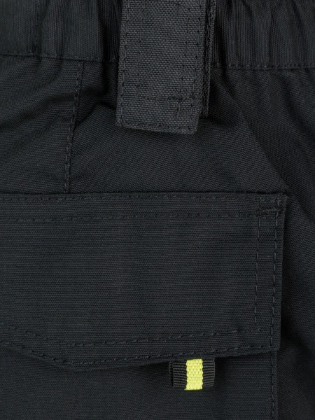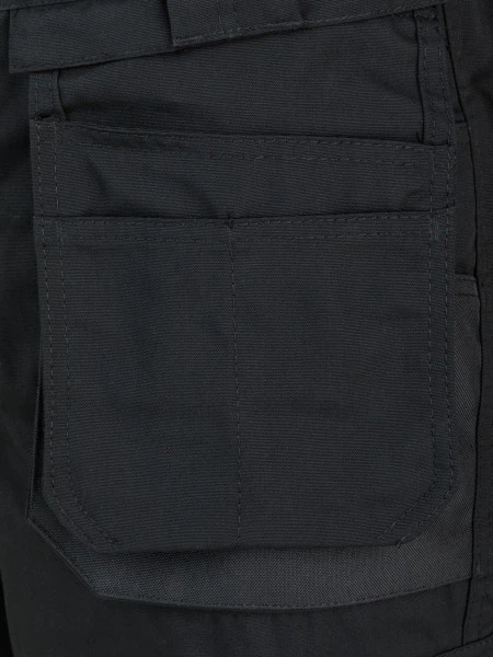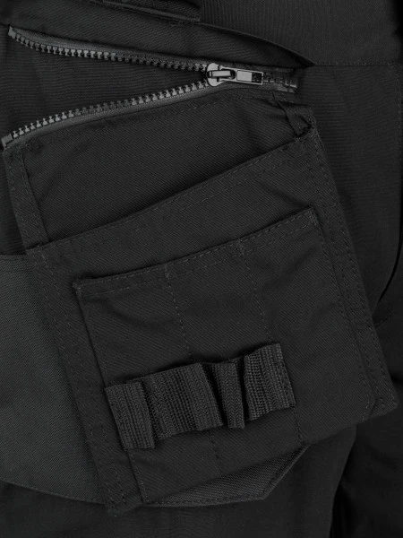 De broek heeft ook verschillende zakken, namelijk twee open en twee met klittenband afsluitbare heupzakken, twee klittenband kontzakken en een duimstokzak. En op beide knieën zitten verstevigde kniezakken voor kniekussens en de broek heeft ook twee afritsbare workerzakken met open zakken en pennenzakken- en houders