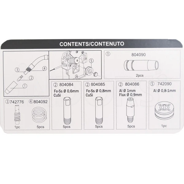De Telwin MIG Ready Box F MT15 bestaat uit een aantal verbruiksartikelen voor uw MT15 MIG/Mag-toorts. Deze set is geschikt voor de Telwin Technomig 215 en 225 en Telwin Electromig 220 lasapparaten. De MIG Ready Box F wordt geleverd in een handig mee te nemen en afsluitbare kunststof box met vakken voor de afzonderlijke onderdelen.